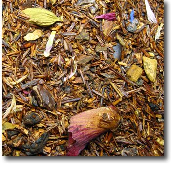 Rooibusch, Johannisbrotstücke, Kakaokerne, Zichorienwurzel, Zimt, Süßholz, schwarzer Pfeffer, Gewürznelken, Kardamomfrüchte, Ingwer, Kardamomsaat, Rosenblütenblätter, Muskatnuss, Vanillestücke, Eichenholz-Extrakt, Ingwer-Extrakt. Aroma.