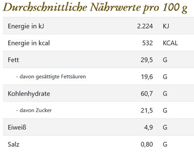Zutaten: Mehl (Weizenmehl, Kalzium, Eisen, Niacin, Thiamin), Butter (Milch, Salz), Zucker, Reismehl, pflanzliche Fette (Raps- & Palmöl), Kann Spuren von Schalenfrüchten enthalten, Kann Spuren von Soja enthalten, Kann Spuren von Ei enthalten